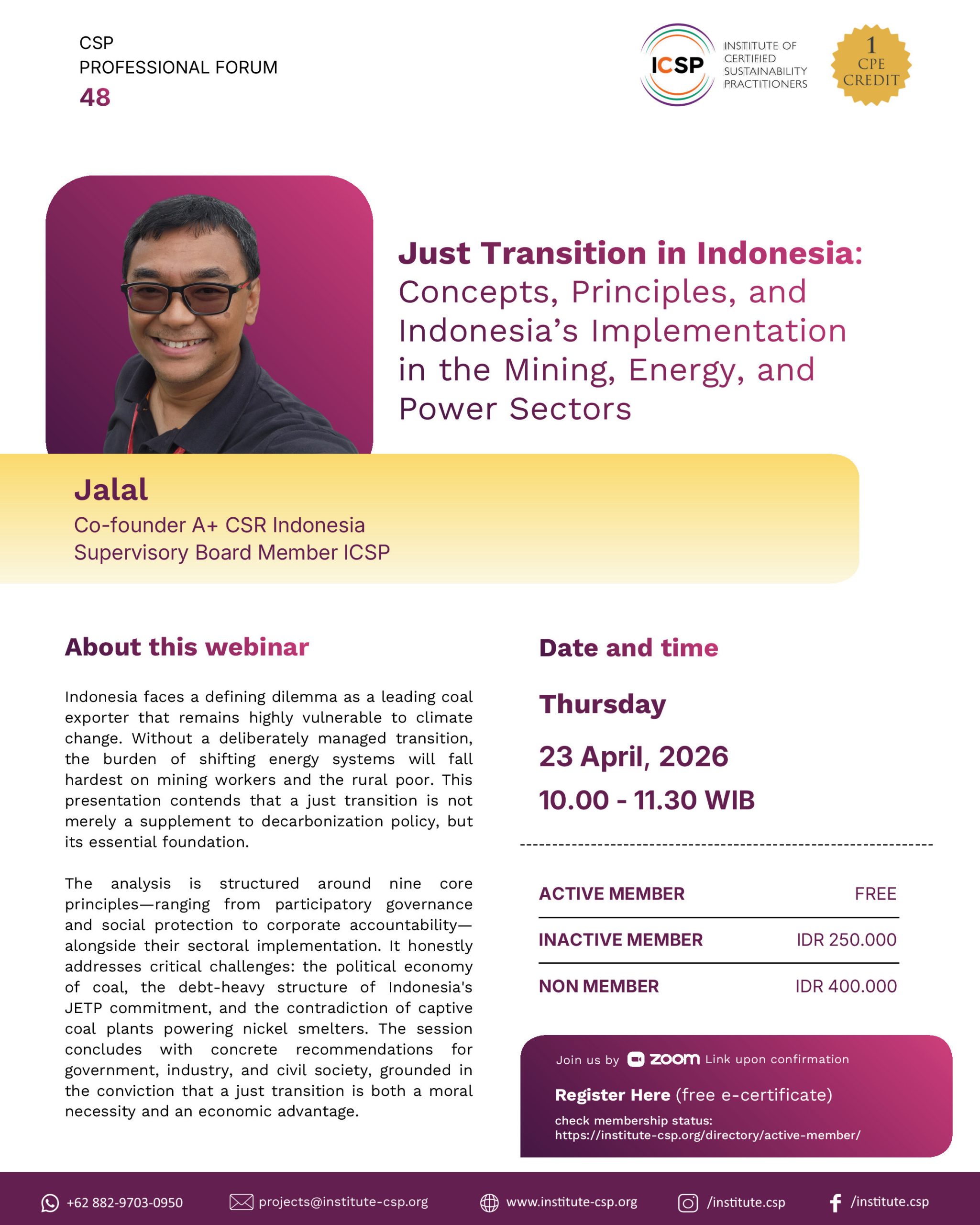 The analysis is structured around nine core principles-ranging from participatory governance and social protection to corporate accountability alongside their sectoral implementation. It honestly addresses critical challenges: the political economy of coal, the debt-heavy structure of Indonesia’s JETP commitment, and the contradiction of captive coal plants powering nickel smelters. The session concludes with concrete recommendations for government, industry, and civil society, grounded in the conviction that a just transition is both a moral necessity and an economic advantage.